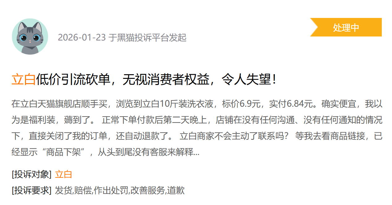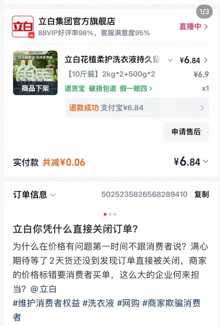 1月22日,多位消费者在社交平台投诉淘股神,在立白官方旗舰店低价购买的商品遭强制退款,原因系立白方面错标价格。