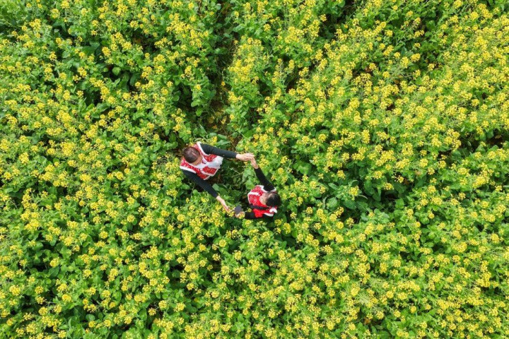 ↑2026年2月20日,在湖南省永州市道县万家庄街道五一社区,游客在油菜花间赏花游玩。(无人机照片)CICPHOTO/蒋克青 摄