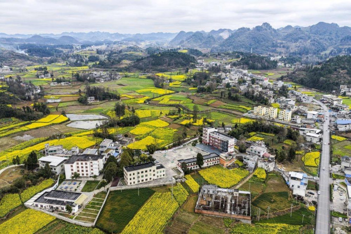 ↑2026年2月27日在贵州省毕节市黔西市雨朵镇思源社区拍摄的油菜花美景。(无人机照片)CICPHOTO/周训超 摄