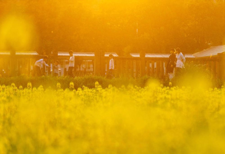 ↑2026年2月28日,在四川省广安市广安区花桥镇,游客在油菜花间赏花游玩。CICPHOTO/张晓 摄